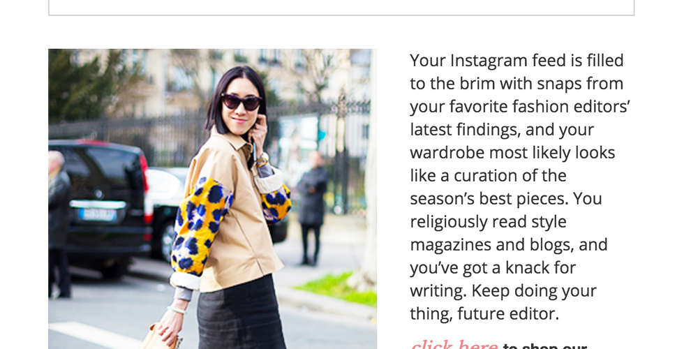So this week I decided to take a fashion career quiz, thereby entrusting complete faith into Teen Vogue’s ability to judge my character and assign me a role in the industry based on questions that could have possibly been constructed by Meg Cabot. To my surprise, I got EDITOR- shoes that I’ve wanted to fill ever since I started weaving my fashion dreams in 2007.